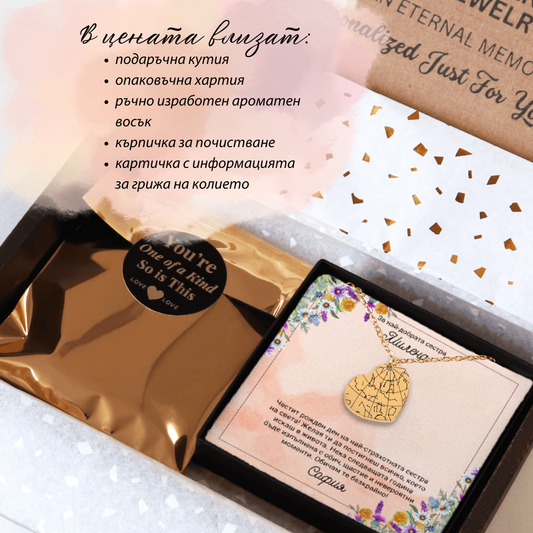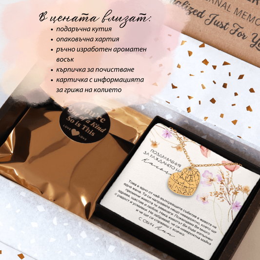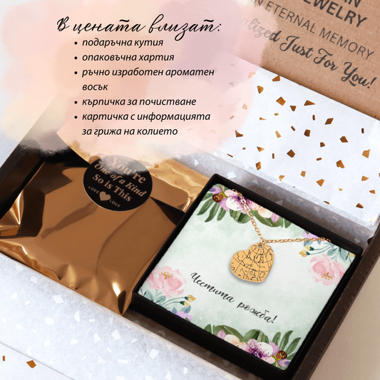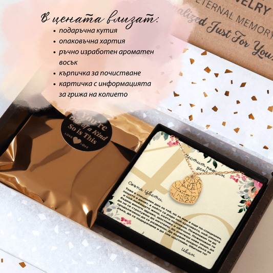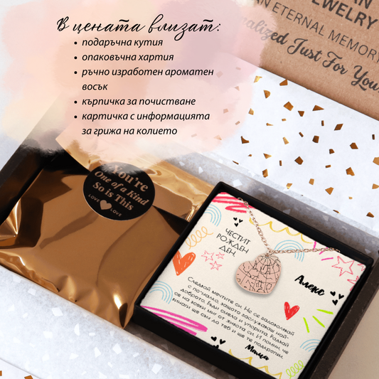 Запечатайте най-важните моменти от вашия живот в едно уникално бижу. Изпратете ни датата и мястото на специалния момент, а нашите дизайнери ще се погрижат за останалото. Всяко колие идва с персонализирана картичка с послание. Ако не намирате картичка, която отговаря на вашия повод, не се колебайте да се свържете с нас. Ще създадем уникален дизайн специално за вас!
